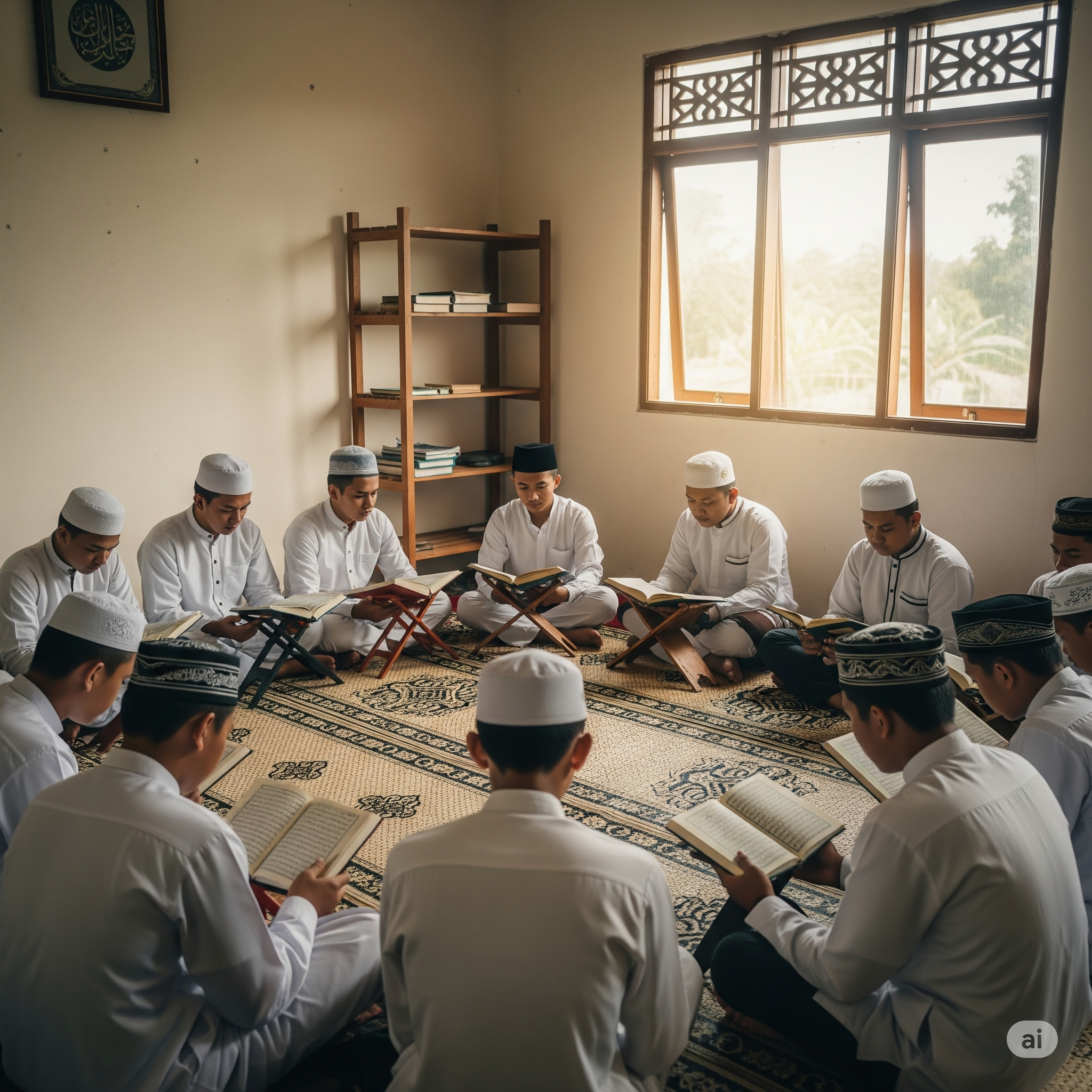 Di tengah keindahan alam Nusantara, Pondok Pesantren Tahfidzul Quran Nusantara berdiri teguh sebagai oase spiritual, sebuah tempat di mana lantunan ayat-ayat suci Al-Quran menggema setiap waktu. Lebih dari sekadar lembaga pendidikan, pesantren ini adalah rumah bagi para huffaz (penghafal Al-Quran) yang berjuang untuk menjaga kemurnian dan keindahan Kalamullah dalam hati dan tindakan mereka. Berakar pada tradisi pesantren salaf yang kuat namun terbuka terhadap perkembangan zaman, Tahfidzul Quran Nusantara memiliki visi mulia: melahirkan generasi Qur'ani yang tidak hanya fasih dalam hafalan, tetapi juga memahami makna, mengamalkan ajaran, dan menjadi teladan bagi umat. Dengan suasana yang khusyuk, sederhana, dan penuh kekeluargaan, pesantren ini menciptakan lingkungan yang kondusif bagi para santri untuk fokus sepenuhnya pada interaksi mendalam dengan Al-Quran. Suasana Pesantren yang Mendalam Seperti yang tergambar dalam foto, kehidupan di Tahfidzul Quran Nusantara dipenuhi dengan rutinitas yang teratur dan penuh berkah. Pagi hari diawali dengan shalat Subuh berjamaah dan dilanjutkan dengan setoran hafalan (ziyadah) kepada para ustadz. Ruang-ruang belajar yang sederhana namun bersih menjadi saksi bisu perjuangan para santri dalam melancarkan ayat demi ayat. Tidak hanya di dalam kelas, interaksi dengan Al-Quran terjadi di setiap sudut pesantren. Di serambi masjid, di bawah rindangnya pepohonan, bahkan di sela-sela kegiatan sehari-hari, selalu ada santri yang membaca, mengulang, atau bertukar hafalan dengan sesamanya (muraja'ah). Kebersamaan dan saling menyemangati menjadi ruh dalam proses menghafal yang terkadang terasa menantang. Kurikulum yang Terintegrasi Meskipun fokus utama adalah menghafal Al-Quran (tahfidz), Pesantren Nusantara menyadari pentingnya pemahaman agama yang komprehensif. Oleh karena itu, kurikulum pesantren juga mencakup: Tahsin dan Tajwid: Pembelajaran mendalam tentang cara membaca Al-Quran yang benar sesuai dengan kaidah ilmu tajwid. Tafsir Al-Quran: Pengenalan makna dan kandungan ayat-ayat Al-Quran secara ringkas. Ilmu-Ilmu Keislaman Dasar: Pembelajaran tentang akidah, akhlak, fiqh ibadah, dan sejarah Islam sebagai landasan pemahaman agama yang kuat. Bahasa Arab: Penguasaan bahasa Arab sebagai kunci untuk memahami Al-Quran dan kitab-kitab turats. Para Pengasuh dan Ustadz yang Penuh Dedikasi Pesantren ini diasuh oleh para kiai dan ustadz yang memiliki sanad keilmuan yang jelas dalam bidang Al-Quran. Mereka tidak hanya mengajarkan teknik menghafal, tetapi juga menanamkan kecintaan yang mendalam terhadap Kalamullah dan memberikan teladan dalam mengamalkan nilai-nilai Al-Quran dalam kehidupan sehari-hari. Hubungan antara ustadz dan santri terjalin layaknya seorang ayah dengan anaknya, penuh perhatian, bimbingan, dan kasih sayang. Kegiatan Sehari-hari yang Mendidik Selain kegiatan belajar-mengajar formal, kehidupan di Tahfidzul Quran Nusantara diisi dengan berbagai kegiatan yang mendukung pembentukan karakter Qur'ani: Qiyamul Lail: Mendorong para santri untuk menghidupkan malam dengan shalat, dzikir, dan tilawah Al-Quran. Kajian Kitab: Mempelajari kitab-kitab klasik tentang ilmu Al-Quran dan agama. Muhadhoroh: Latihan berdakwah dan menyampaikan pesan-pesan Al-Quran kepada sesama. Kegiatan Sosial: Menumbuhkan rasa kepedulian terhadap masyarakat sekitar melalui kegiatan bakti sosial dan pengabdian masyarakat. Mencetak Generasi Rabbani Pondok Pesantren Tahfidzul Quran Nusantara bercita-cita melahirkan generasi Rabbani, yaitu generasi yang memiliki hubungan yang kuat dengan Allah SWT melalui Al-Quran. Para lulusannya diharapkan tidak hanya menjadi penghafal yang handal, tetapi juga menjadi agen perubahan positif di tengah masyarakat, mengamalkan nilai-nilai Al-Quran dalam setiap aspek kehidupan mereka.